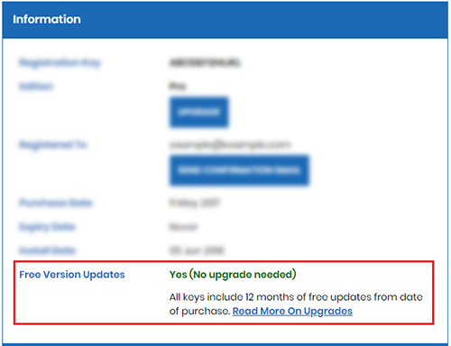 If you are not eligible you can purchase an additional 12 months of version updates by pressing the purchase button on the account page as shown in the picture above.