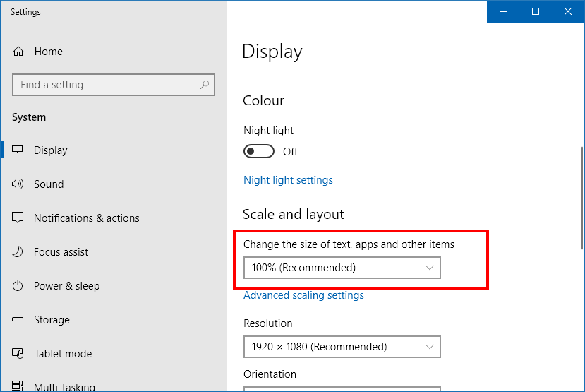 2. From the Display Settings window, changing the scaling to 100% as shown below.