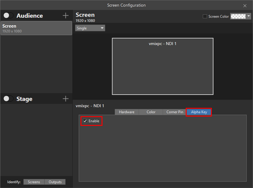 If you would like your NDI output from ProPresenter to include an alpha channel (transparency), then from this same window, select the Alpha Key tab. Then tick the checkbox Enable.