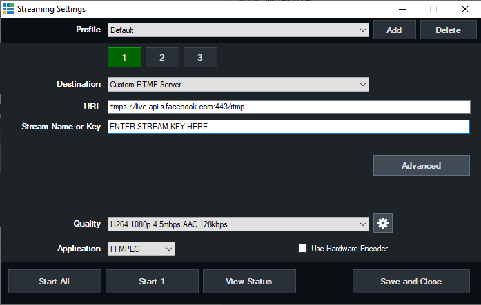 Go to vMix and open the stream settings window. For the Destination type, choose Custom RTMP Server. Then enter in the Stream URL and Stream Key you have copied from Facebook. Once setup, start your stream.