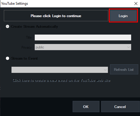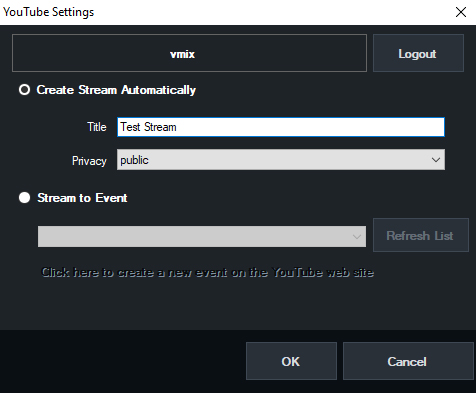 Once logged in, return to vMix. To create a stream automatically, click the first option for Create Stream Automatically and enter in a Title and Privacy setting for your stream.