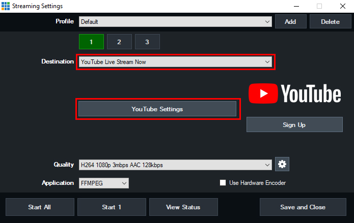 Choose Youtube Live Stream Now from the Destination dropdown menu. Click YouTube Settings button to setup your Stream.