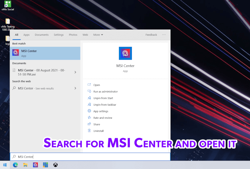 1) Search for the MSI Center application on your MSI Laptop.
