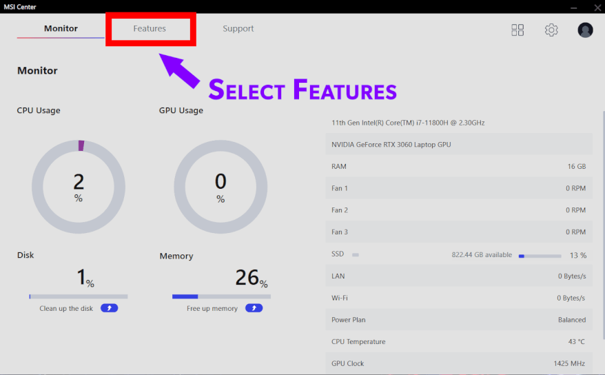 2) Once you have opened MSI Center select the Features option on the menu.