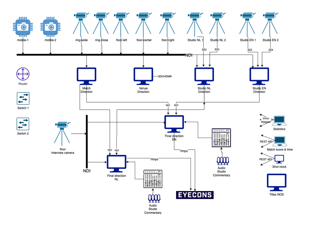 The production was run with 12 cameras from which 2 had a wireless connection. 8 cameras were connected via a BirdDog NDI encoder to a LAN. The other 4 cameras were connected via SDI directly to PC capture cards.